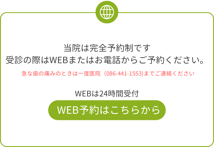 | 診療内容 | 予防歯科/むし歯治療/歯周病治療/小児歯科/小児矯正/根管治療/義歯治療(入れ歯)/審美治療 |